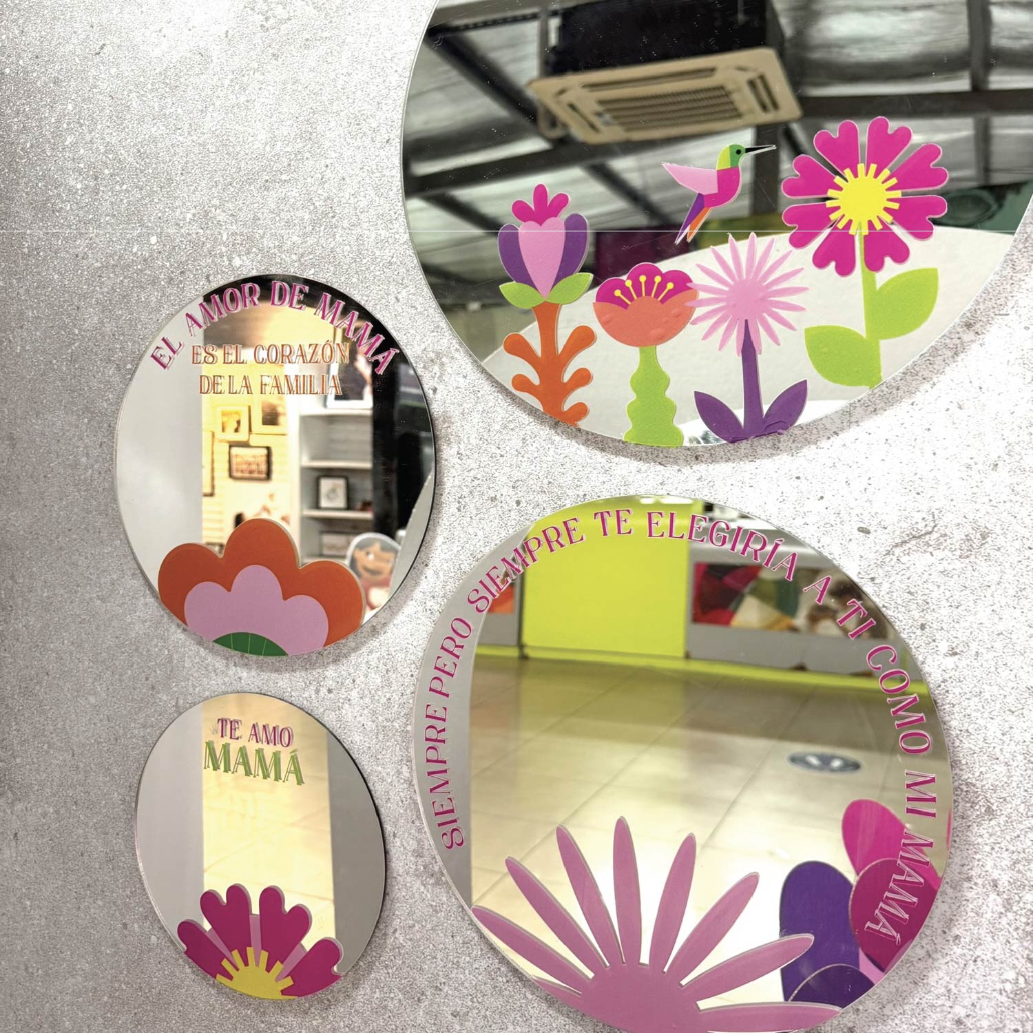 Los espejos son de vidrio y el grabado es UV, Puedes personalizar si así gustas el texto